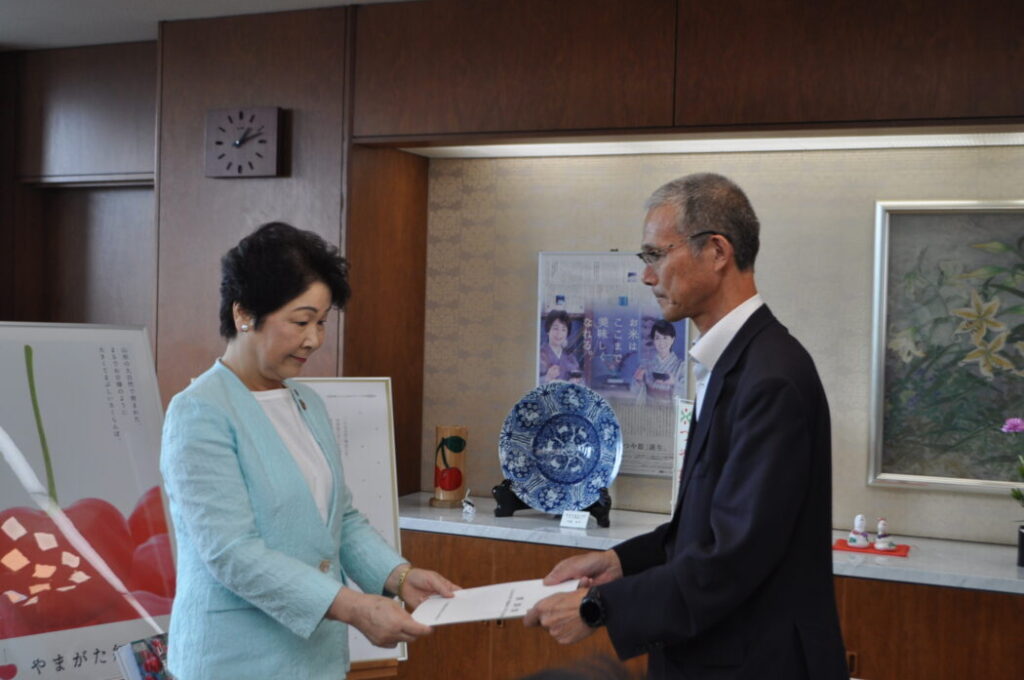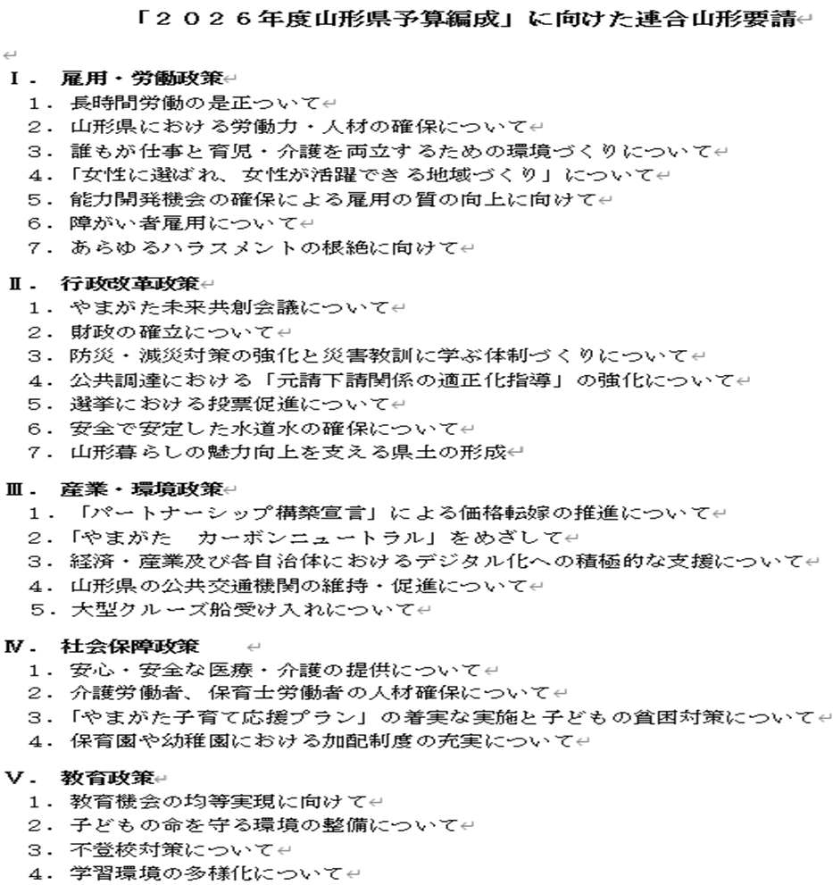9月11日(木)、山形県庁「知事室」において、「2026年度山形県予算編成に向けた連合山形政策制度要請」を舩山会長から吉村美栄子山形県知事に手交し、要請内容の「やまがた未来共創会議」について回答いただき、意見交換を行いました。要請内容は5分野計27項目あり、10月24日に連合山形の要請内容に対して担当部署との意見交換を行います。