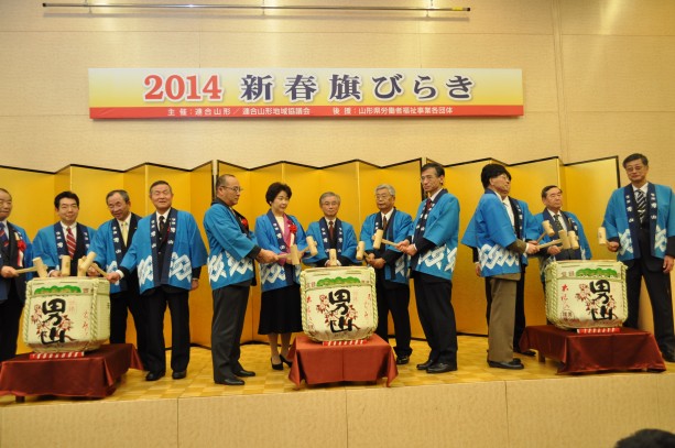 来賓を代表し、吉村美栄子山形県知事、市川昭男山形市長、近藤洋介民主党県連会長、高橋啓介社会民主党県連幹事長の4名より祝辞をいただき、来賓者による鏡開きのあと、須永敏良山形労働局長の発声で乾杯を行いました。